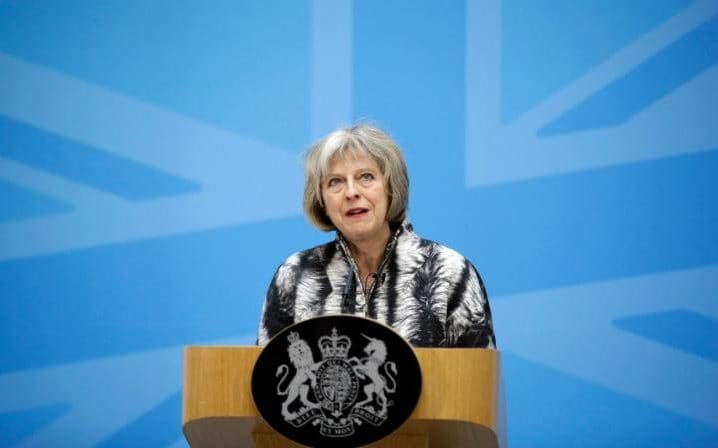 Britain's Home Secretary Theresa May delivers her keynote address on the second day of the Conservative party annual conference in Manchester