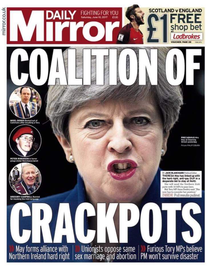 Well, although I’m as yet barely able to grasp a baby’s rattle, let alone the ins and outs of political horsetrading, I find the whole DUP thing interesting for three main reasons. Firstly, it puts paid to any notion of the Conservatives as anything other than deeply socially reactionary and driven by the will to power. It’s now ten years since David Cameron went around pretending he could talk to huskies. Even at the time, even though I wouldn’t be born for another nine years and eight months, I could see that it was all a charade, but the image did stick, and when he resigned there were people praising him for his social progressiveness on (for example) gay marriage. That sort of notion of the Tory Party is now absolutely dead. For all the talk of ‘modernisers’, it’s an atavistic, pre-modern assemblage. Secondly, something that’s not been discussed much is anti-catholicism. I think it’s paid very little attention to in England – commentary on the DUP has mostly focussed, rightly I think, on their homophobia, climate denial and misogyny – but it’s still a theme in English life. We sort of outsource that part of our history to the fringes and pretend it no longer exists, but I’d be very interested to know how catholic Tories view this agreement. Finally, there’s the lack of strategic thinking. This deal won’t last. The alacrity with which it was announced suggests strongly to me that May just agreed to give the DUP whatever they want, and that will obviously lead to problems in the medium term if not before. I think people did use to think of May as someone who possessed a modicum of political intelligence, but in strategic terms she’s not much more sophisticated than her new best friend, that outright dickhead in the United States. Maybe, as some wag put it on Twitter, she has a thing for orangemen…